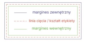 Pamiętaj aby odsunąć ważne elementy projektu Twojej etykiety od linii cięcia. Zalecamy aby margines wewnętrzny wynosił 2-3mm na każdą ze stron. Podobnie z marginesem zewnętrznym, czyli wypełnieniem etykiety. Również powinno ono wynosić 2-3mm.